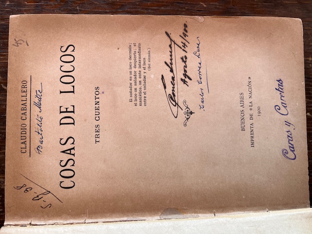 Tapa dura con las cubiertas. Lomo desencolado. Contiene: Á solas con un loco, Entre la nieve, Los Zaldarriaga. Claudio Caballero es el pseudónimo de Bartolomé Mitre.