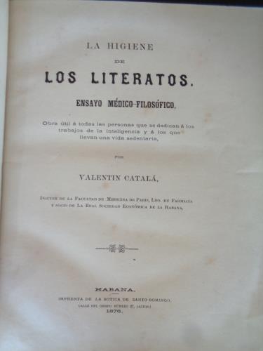 Obra útil a todas las personas que se dedican a los trabajos de la inteligencia y a los que llevan una vida sedentaria por Valentin Català, Doctor de la Facultad de medicina de Paris, Ldo. en Farmacia y socio de la Real Sociedad Económica de la Habana. Cubierta de piel con el lomo muy fatigado.Cubierta con manchas. Manchas de óxido que no afectan a la lectura.