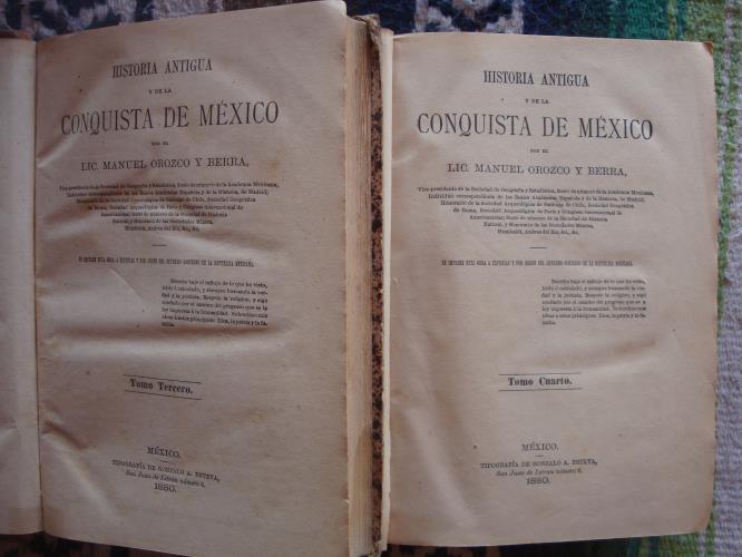 Holandesa de la época. Trabajo fundamental sobre la Historia de México. En el tomo IV estan incluidos las 18 láminas plegadas y el Croquis de México Tenochtitlan, que algunas veces se presenta en volumen aparte y se describe como Quinto Tomo. El tomo I tiene una mancha de agua en la parte baja de las paginas sin afectar texto.