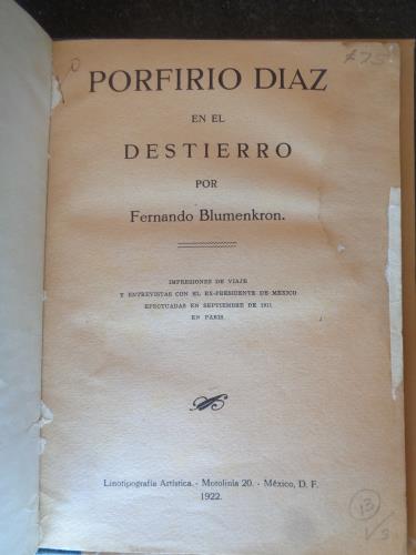 Impresiones de viaje y entrevistas con el ex-presidente de México efectuadas en septiembre de 1911 en Paris. Holandesa, con cubiertas. Ligera orla de agua en la parte lateral de las páginas, sin afectar la lectura.
