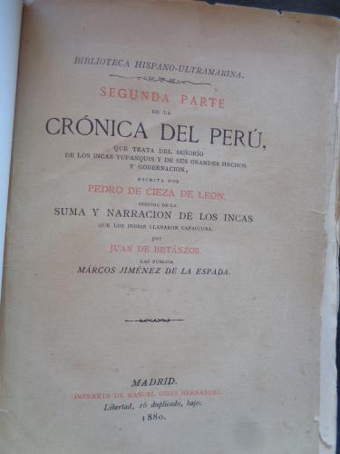 Que trata del Señorío de los Incas Yupanquis y de sus grandes hechos y gobernación. Pasta española, Pequeña rotura en la esquina inferior de la hoja de encuadernación. Primer libro publicado sobre el Imperio de los Incas de manera profunda y cuidadosa por un narrador del siglo XVI. Cieza de León, "el príncipe de los cronista peruanos". Edición diferente en presentación a la que incluye el texto fragmentado de Betanzos.
