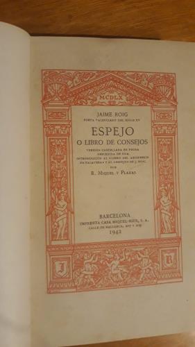 Versión castellana en prosa precedida de una introducción al "libro del arcipreste de Talavera" y al "Espejo" de J. Roig por R. Miquel y Planas. Edición fuera de comercio. Tirada especial de 100 ejemplares para los amigos del traductor. Queratol con cubiertas.
