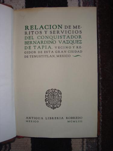 Piel con las cubiertas. Esta Relación de méritos se ha reimpreso varias veces por ser un importante testimonio sobre la conquista de un personaje destacado en ella. Palau por error anota 1929 en lugar del correcto 1939.