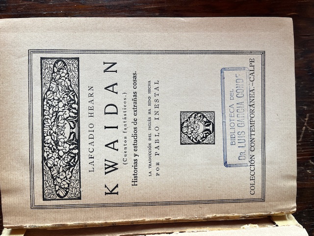 Tapa dura con las solapas. Lomo desencolado en el interior. Contiene: Introducción; La historia de Mimi-nashi-hoichi; Oshidori; La historia de O-tei; Ubazakura; Diplomacia; De un espejo y de una campana; Jikininki; Mujina; Rokuro-kubi; Un secreto muerto; Yuki-onna; La historia de Aoyagi; Jiu-roku-zakura; El sueño de Akinosuke; Riki-baka; Hi-mawari; Horai; Estudios de Insectos: Mariposas; Mosquitos; Hormigas. Sello del propietario anterior.