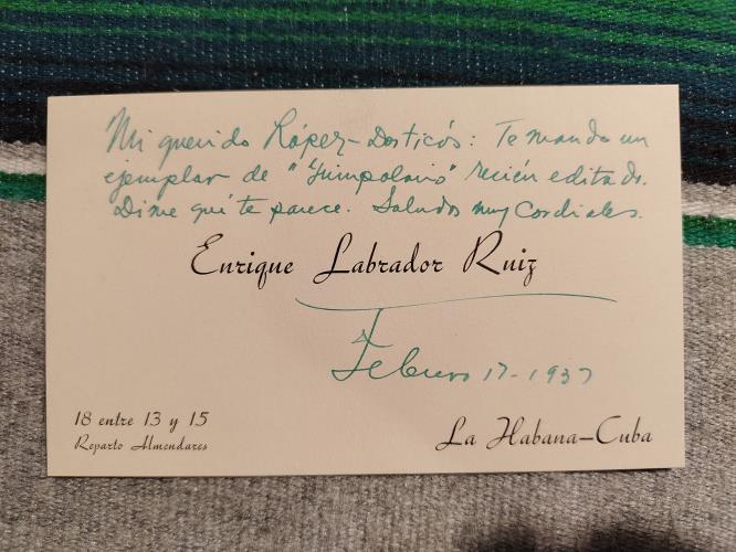 Rústica con las cubiertas. Cubierta principal desprendida. Targeta manuscrita del autor. Autógrafo ej. Pedro: "A Pedro López-Daticos. Muy cordialmente. Labrador Ruiz. 1939.".