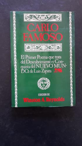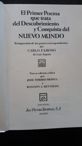 Rústica con las cubiertas. El Primer Poema que trata del Descubrimiento y Conquista del Nuevo Mundo, de Luis Zapata. Reimpresión de las partes correspondientes del Carlo Famoso. Nueva edición crítica.