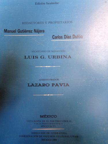 Redactores y propietarios: Manuel Gutiérrez Nájera y Carlos Díaz Dufóo. Secretario de redacción: Luis G. Urbina. Administrador: Lázaro Pavia. Rústica, con las cubiertas. Edición de 1000 ejemplares.
