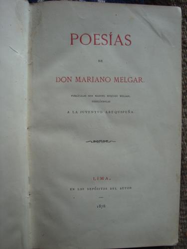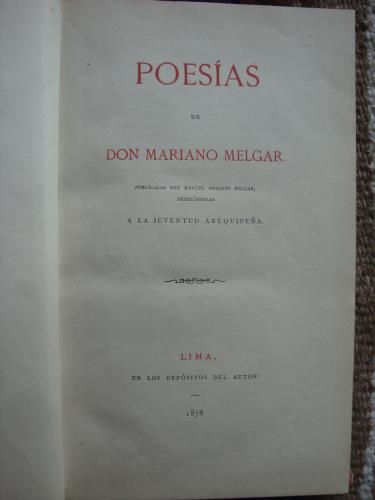 Holandesa, de la época, raspones en las puntas y en los bordes y bisagras del lomo. Dedicatoria particular en página de cortesía. Melgar está considerado como el introductor del yaravi -poesía indígena, quechua, para ser acompañada con música de quena- en la poesía hispanoamericana.