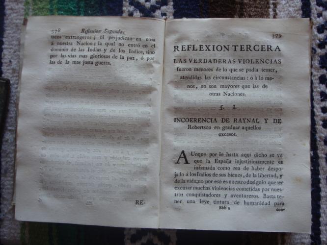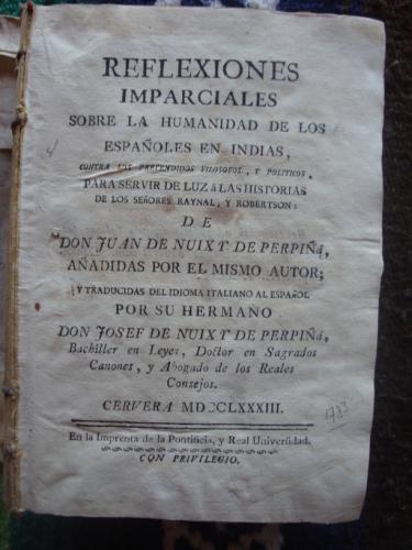 Título completo: Reflexiones imparciales sobre la humanidad de los españoles en las Indias, contra los pretendidos filósofos y políticos. Para ilustrar las historias de MM. Raynal y Robertson. Pergamino de la época.