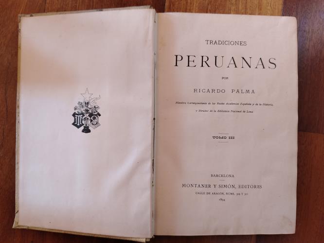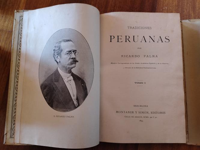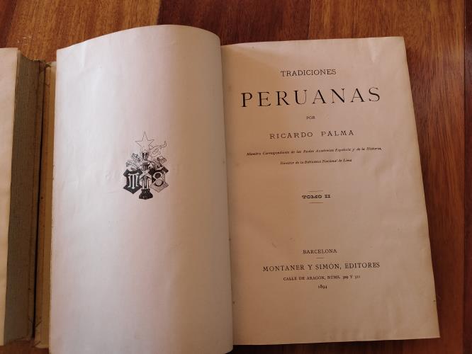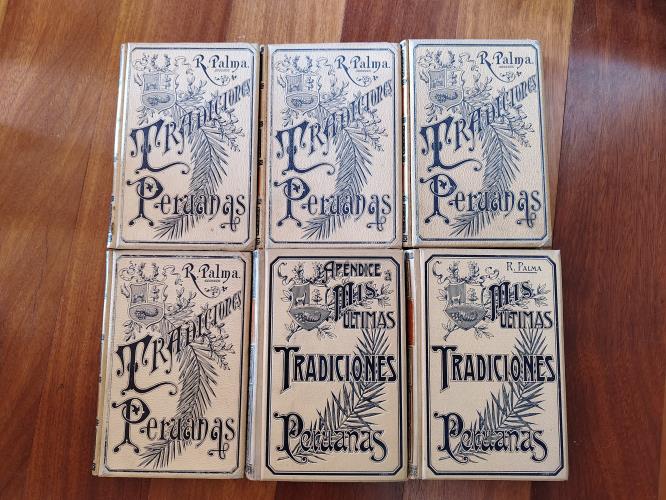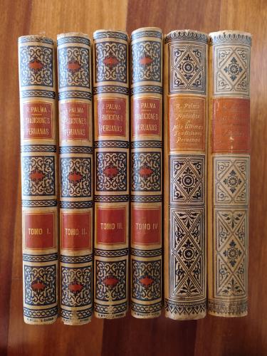 Ex libris de anterior dueño tras la portada. El IV tomo lleva como subtítulo "Ropa vieja"; el tomo V se titulo "Mis últimas tradiciones peruanas y Cachivacheria"; El tomo VI se títula: "Apendice a mis últimas tradiciones peruanas". Tipo pergamino, original de la edición.