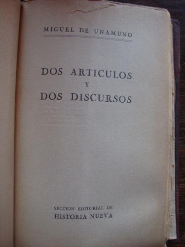 Rústica con las cubiertas. Firma anterior propietario en página de cortesía. Papel transparente de protección con pérdidas en el lomo. Artículos publicados por Unamuno en la revista Ahora en 1933.