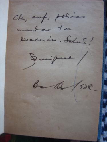 Rústica, con las cubiertas, fatigadas; perdidas y dobleces en el lomo, alcanzando la cubierta delantera. Marcas y anotaciones, generalmente en lápiz, del anterior propietario, distinguido crítico. Páginas sombreadas por papeles ahora ya retirados.Dedicatoria manuscrita de Jorge Luis Borges, con pleno dominio aún de la escritura, lo cual hace más rara la dedicatoria... y el libro.