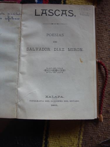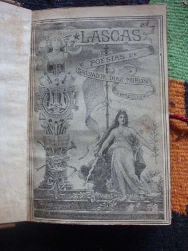 Piel, conservando las cubiertas. Retrato del autor. Dedicatoria manuscrita de Díaz Mirón a Jesús Valenzuela, relevante poeta y mecenas mexicano del modernismo, recortada en el margen izquierdo pero sin impedir deducir lo que dice. Libro muy importante de la poesía hispanoamericana y española.