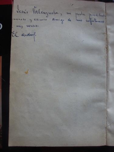 Rústica, con las cubiertas, sin lomo y sin la cubierta posterior. Manchas de óxido y mancha de humedad en el borde derecho. Dos últimas hojas sueltas. Larga dedicatoria a poeta chileno.