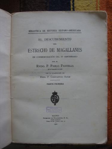 La primera parte trata de Magallanes. Obra muy importante. Rústica, con las cubiertas. Rotura en la parte superior de la cubierta.