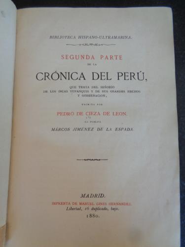 Que trata del Señorío de los Incas Yupanquis y de sus grandes hechos y gobernación. Pasta española, Pequeña rotura en la esquina inferior de la hoja de encuadernación. Primer libro publicado sobre el Imperio de los Incas de manera profunda y cuidadosa por un narrador del siglo XVI. Cieza de León, "el príncipe de los cronista peruanos". Edición diferente en presentación a la que incluye el texto fragmentado de Betanzos.