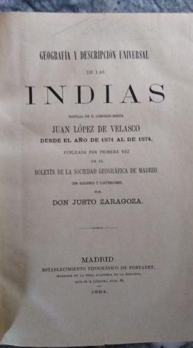 Recopilación des de el año 1571 al 1574, publicada por primera vez en el Boletín de la Sociedad Geográfica de Madrid. Con adiciones e ilustraciones por Don Justo Zaragoza. Encuadernación de piel.