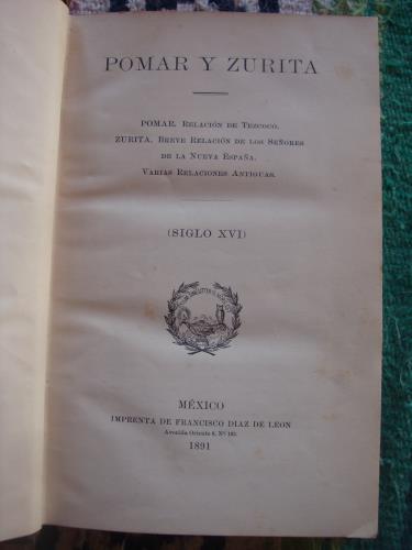 Subtítulo: Pomar. Relación de Tezcoco. - Zurita. Breve Relación de de los Señores de la Nueva España. -Varias Relaciones antiguas. Holandesa, con raspones en los bordes del plato y el lomo.. Edición de 200 ejemplares. Palau, 230671, cita la edición de 1941 y envia a una ficha que no guarda relación (debe ser un error tipográfico).