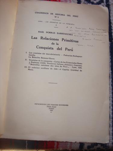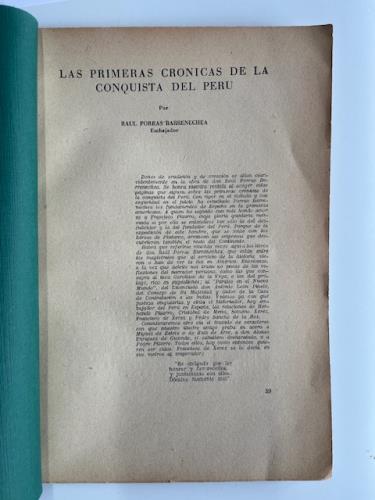 Subtítulo: Lisonja y vejamen de la ciudad de los Reyes del Perú. Cronistas, viajeros y poetas. Fotografía del Presidente del Perú, general Oscar R. Benavides. Rústica, con las cubiertas, sucias. Bordes y bisagras con raspones. Dedicatoria manuscrita de Porras.