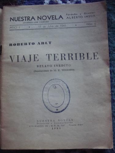 Rústica, con las cubiertas. En la cubierta dice "Un viaje terrible", pero en la portada solo "Viaje terrible", y sigue llamándose así en la lista de numeros publicados y al iniciar el texto de la obra. Ilustraciones de M.F. Teijeiro.