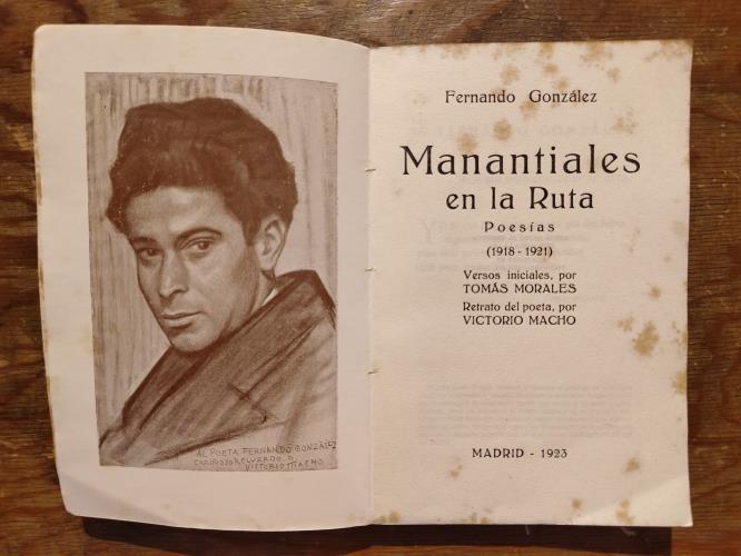 Rústica con las cubiertas. Versos iniciales por Tomás Morales. Retrato del poeta por Victorio Macho. Manchas de óxido en el interior.