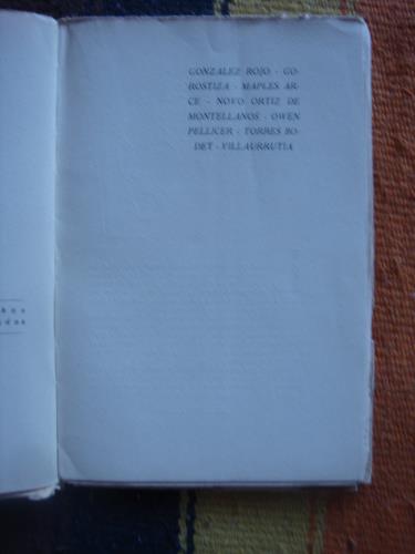 Poetas incluídos: Enrique González Rojo, José Gorostiza, Manuel Maples Arce, Salvador Novo, Bernardo Ortiz de Montellano, Gilberto Owen, Carlos Pellicer, Jaime Torres Bodet y Xavier Villaurrutia. Rústica, con las cubiertas. Retrato de cada poeta dibujado por Maroto. Salvo el primer pliego, intonso. Titulo en la cubierta: Galería de poetas nuevos de México.