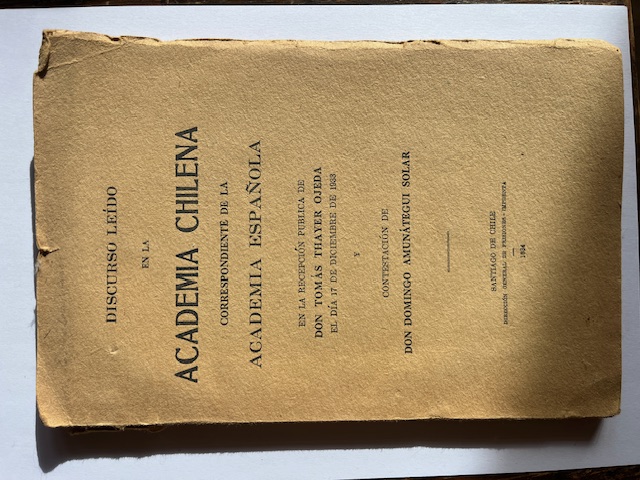 Rústica. Bordes fatigados. Intonso. Recepción pública de Don Tomás Thayer Ojeda el día 17 de diciembre de 1933. Incluye contestación de Don Domingo Amunátegui Solar.
