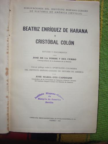Pasta española. Sello de entidad en la portada. Es el único trabajo publicado sobre la mujer de Colón en España, y madre de su hijo Hernando. Colón no se casó con ella pero siempre encargó a sus hijos que se le diera una pensión.