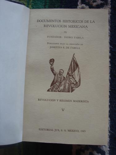 Subtítulo: Revolución y régimen maderista. Holandesa, con las cubiertas. A la muerte de Isidro Fabela su esposa se ocupó de dirigir la recopilación y edición de los documentos.