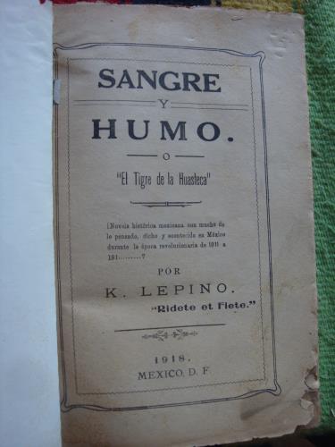 Subtítulo:" (Novela histórica mexicana con mucho de lo pensado, dicho y acontecido en México durante la época revolucionaria de 1911 a 191............?). Holandesa, con las cubiertas, con roturitas en los bordes y más acentuada en la esquina de la derecha, en ala parte baja. Esta es una de la más raras novelas de la Revolución mexicana, escrita, quizá, por algún hacendado español, de San Luis Potosí, y que pasó muchas dificultades para ser impresa: papel, tipos, calidad de impresión. Lleva el pie de imprenta de 1918, pero lo que se narra llega hasta la muerte de Carranza en 1920.