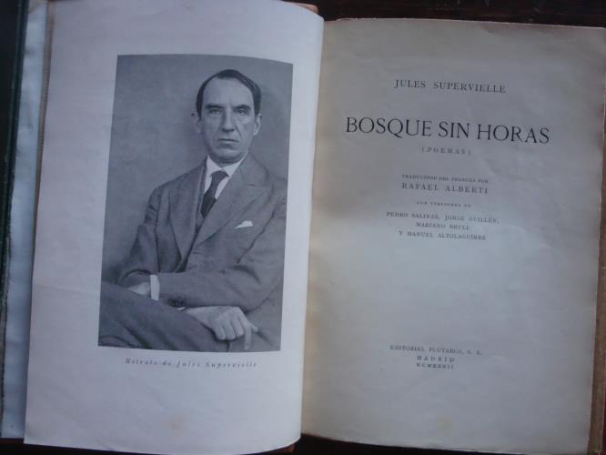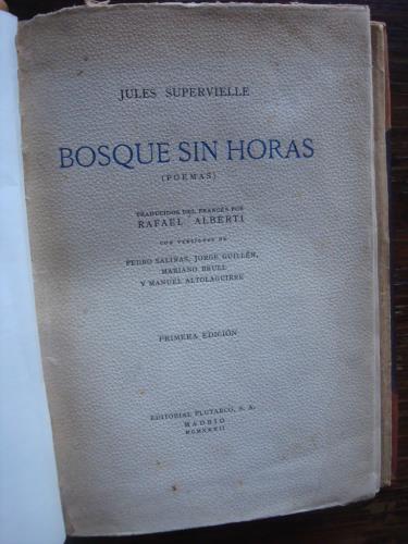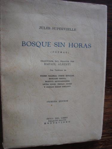 Edición uruguaya encuadernada en el mismo volumen. Jules Superville//Bosque sin horas//(poemas)//traducidos del fránces por//Rafael Alberti//con versiones de//Pedro Salinas, Jorge Guillén//Mariano Brull//Manuel Altolaguirre//Luisa Luisi, Emilio Oribe//y Carlos Ercasty //Primera edición//Feria del Libro// Palacio Salvo//Montevideo.